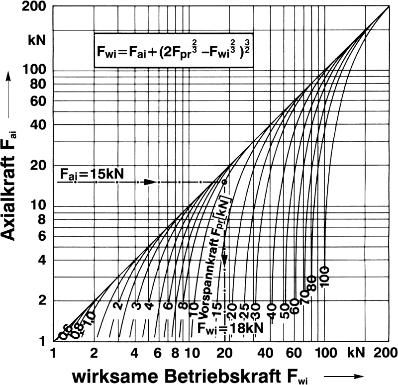 der Mutternvorspannung Der jeweiligen Betriebskraft Fai wird durch die Vorspannung Fpr eine weitere Kraft überlagert. Die dabei wirksam werdende Betriebskraft Fwi ist statt Fai im Belastungskollektiv der Lebensdauerberechnung einzusetzen. |
